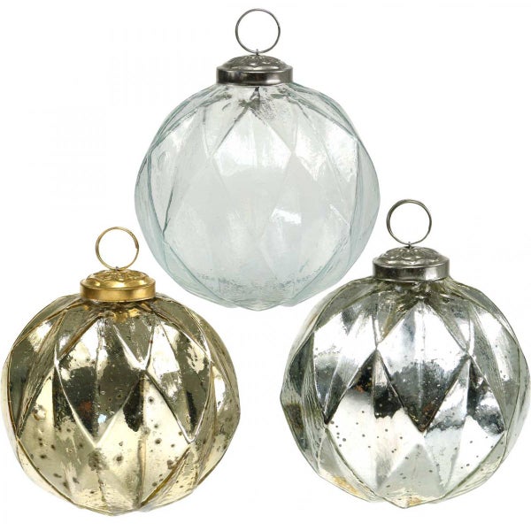 Vintage Weihnachtskugeln Glas Ø10,5cm 3er Set, Rauten-Muster, Baumschmuck inkl. Haken, Transparent, Silber, Gold, 3 Stück