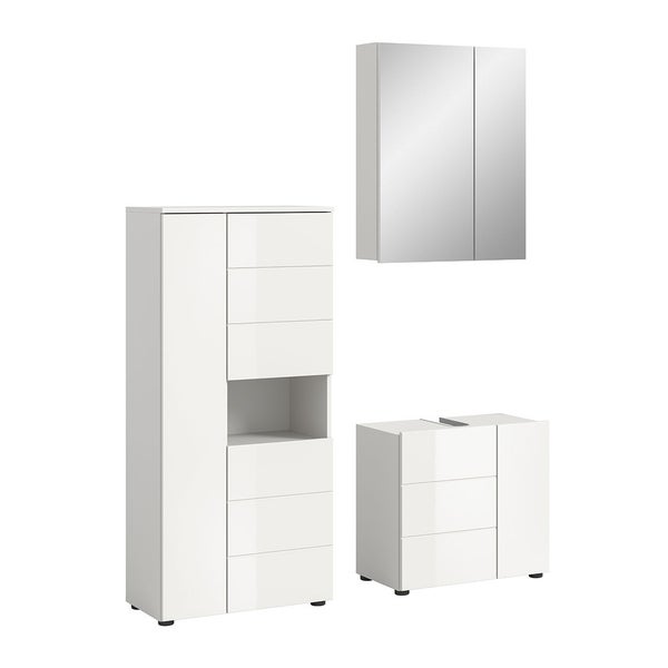 Bringen Sie Ordnung und Eleganz in Ihr Badezimmer mit der Vira Badwelt in Hochglanzweiß. Dieses Komplettset enthält drei funktionale Elemente: einen Spiegelschrank mit zwei Türen, einen stilvollen Waschtischunterschrank (ohne Waschbecken und Armatur) und einen geräumigen Hochschrank mit geschlossenen Fächern und offenen Regalen.