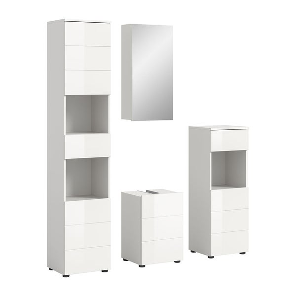 Gestalten Sie Ihr modernes und funktionales Badezimmer mit der Vira Badlandschaft in Hochglanzweiß. Das Set besteht aus vier Teilen: einem Hochschrank mit viel Stauraum, einem Spiegelschrank, einem Waschtischunterschrank und einem Unterschrank mit offenem Fach und Schublade. Alle Teile sind in einem stilvollen und zeitlosen Look gestaltet, mit glänzenden Fronten, die das Licht reflektieren und dem Raum eine elegante Ausstrahlung verleihen.