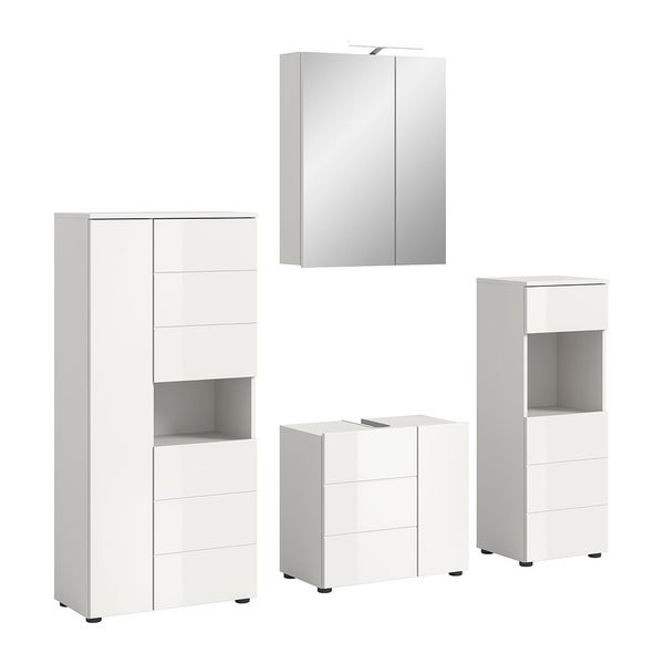 Werten Sie Ihr Badezimmer mit dieser kompletten Vira Badlandschaft in elegantem Hochglanzweiß auf. Das Set besteht aus fünf funktionalen Teilen: einem Hochschrank, einem Waschtischunterschrank (ohne Waschbecken und Armatur), einem Spiegelschrank mit zwei Türen und integrierter LED-Beleuchtung sowie zwei praktischen Unterschränken.