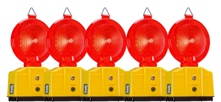 Vollsperrung = 5 x rote Warnleuchte, Baustellenleuchte -rot - mit Blinklicht und Dauerlicht (Umschaltbar) + 1 Lampenschlüssel. Bitte beachten Sie das je nach Einsatzgebiet die Warnleuchten als einseitige oder zweiseitige Leuchten angeboten werden.
