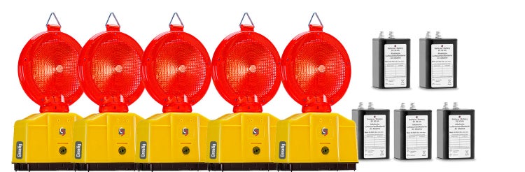 UvV Vollsperrung Set 5 x LED Warnleuchten rot - Lichtaustritt einseitig – mit 5 x Langzeitbatterien Typ 4R25 mit 50 Ah – Die leuchten können mit nur einer Batterie betrieben werden.