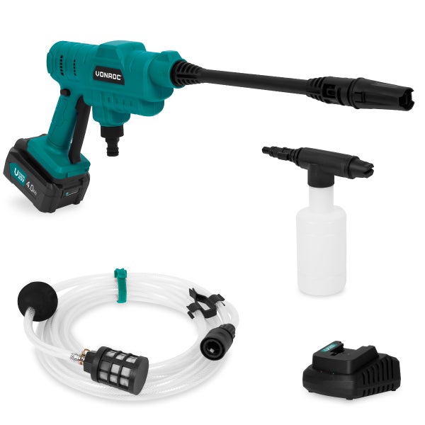 Die Bestellung von austauschbaren 2,0-Ah- oder 4,0-Ah-Akkus ist optional. Wenn Sie den Hochdruckreiniger mit einem anderen Produkt aus der VONROC VPower 20V-Plattform kombinieren möchten, brauchen Sie nur einen Akku und ein Schnellladegerät! Wählen Sie einfach das Wesentliche – zu einem günstigen Preis!