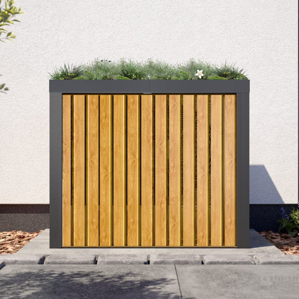 Die Wärmepumpenverkleidung DEKOR-Element Wärmepumpe ist mit verschiedenen Dachlösungen erhältlich, darunter zählen das Flachdach, Pflanzdach und Rhombusdach. Zudem verfügt die Verkleidung über Zaunlatten aus Rhombus Lärche/ Thermkiefer, die nicht nur eine natürliche Optik bieten, sondern auch eine hohe Stabilität gewährleisten.