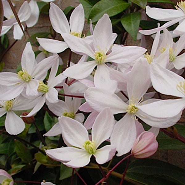 Entdecken Sie die zarte Schönheit der Clematis armandii 'Apple Blossom' Waldrebe in unserem Sortiment. Diese winterharte Pflanze bringt zarte rosa Blüten in Ihren Garten.