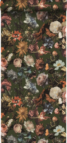 Die Schönheit der Natur zuhause genießen: Diese Tapete mit Blumenmuster in Grün, Rosa und Orange verleiht jeder Wand eine natürliche Note und schafft eine ruhige, entspannte Atmosphäre.