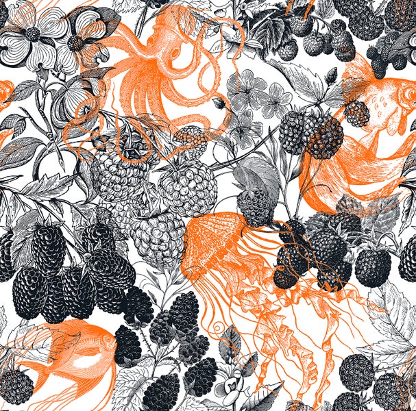 Die Schönheit der Natur zuhause genießen: Diese Tapete mit Obst und Tieren in Schwarz und Orange verleiht jeder Wand eine natürliche Note und schafft eine ruhige, entspannte Atmosphäre.