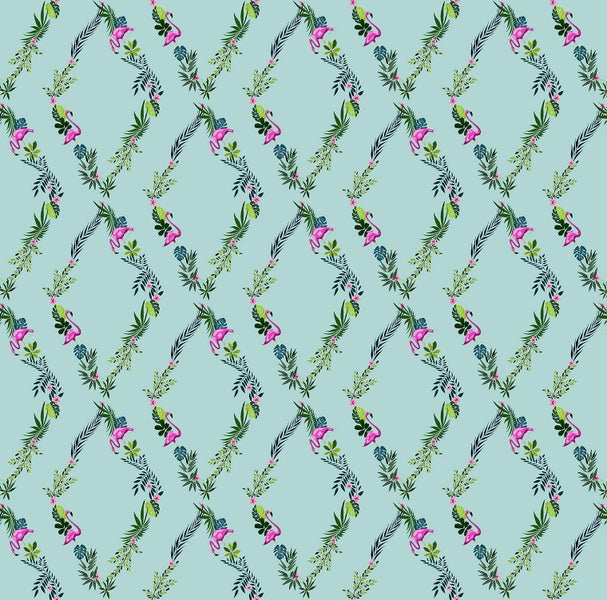 Diese trendige Tapete mit tropischen Pflanzen in Türkis und Grün bringt den Dschungel nach Hause und sorgt für eine lebendige, exotische Atmosphäre. Kombiniert mit vielen Pflanzen und natürlichen Materialien wird der tropisch-botanische Look komplett umgesetzt.
