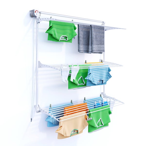 Foxydry Tower verfügt über drei unabhängige Gittern, die für maximale Flexibilität ausgelegt sind. Ein Gitter lässt sich bis zu 1,3 Meter von der Wand ausfahren, während das andere fest unten bleibt und das dritte auf mittlerer Höhe positioniert ist, was individuelle Trockenoptionen ermöglicht.