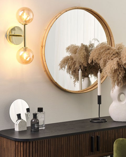 Moderne Wandleuchte mit 2 Glühbirnen. Eine Wandleuchte, die sicher eine glamouröse Atmosphäre schafft. Da sie aus 2 Leuchten besteht, eignet sie sich perfekt als Raumbeleuchtung im Arbeitszimmer oder Büro und kann mit verschiedenen Einrichtungsstilen kombiniert werden. Zudem lässt sie sich dank der halbtransparenten Schirme hervorragend mit dekorativen Glühbirnen kombinieren. Aus Stahl gefertigt, benötigt sie keine tägliche Pflege und hält viele Jahre lang. Details: Typ Wandleuchten. Farbe: Gold. Material: Metall. Material: Stahl. Zusätzliches Material: Glas. Material Lampenschirm: Glas. Fassung: Max. 28 W. Schutzklasse: IP 20. Anzahl der Glühbirnen: 2. Spannung 230 V (50 Hz). Abmessungen: Tiefe: 12 cm. Breite: 36 cm. Höhe: 12 cm. Gewicht: 0.5 kg. .Sie kaufen: 1 x Wandlampe, Nicht im Lieferumfang enthalten: Leuchtmittel. Produktvorteile: Sorgt für eine gleichmäßige Beleuchtung des Raumes, Dekorativ und zugleich funktional, Ein einzigartiger Hingucker, Solide Verarbeitung, Pflegeleichtes und strapazierfähiges Material. Montage: Erfordert Installation und Montage.5 - 15 Min. Zusatzinformationen: Die Lampe besitzt keinen eigenen Ein/Ausschalter und benötigt daher einen separaten Schalter an der Wand Pflegeanleitung: Stahl: 1.Bitte ausschließlich handelsübliche, milde Reinigungsmittel und weiche Tücher verwenden, wobei feuchte Stellen sofort trocken gerieben werden sollten. 2.Vermeiden Sie scheuernde Reiniger, da diese die Oberfläche beschädigen können. 3.Bei Chrom und Kupfer regelmäßig mit speziellen Pflegemitteln polieren. Glas: 1.Bitte ausschließlich milde Reinigungsmittel bzw. Glasreiniger und weiche Tücher verwenden. Feuchte Stellen mit einem weichen Tuch trocken reiben. 2.Keine scheuernden Reinigungsmittel nutzen, da diese die Oberfläche beschädigen können.