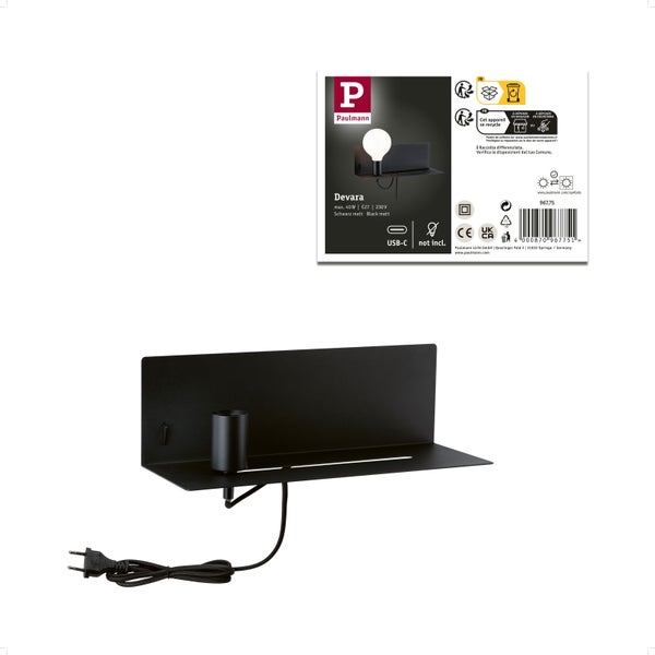 Wandleuchte Devara USB C E27 1800K 110lm 230V 3,5W Schwarz matt