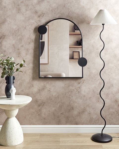 Moderne Wandspiegel. Mit seinem geschwungenen Rahmen verleiht dieser Wandspiegel Ihrem Zuhause einen modernen Touch. Seine abgerundete Form macht ihn zu einem trendigen und auffälligen Accessoire für Wohnzimmer, Flur oder Schlafzimmer. Verleihen Sie Ihrem Interieur einen Hauch von zeitlosem Stil. Details: Typ Wandspiegel. Farbe: Schwarz. Material: Metall. Material: Eisen. Zusätzliches Material: Glas. Form: Bogenförmig. Finish: Pulverbeschichtet. Ausrichtung: Vertikal. Abmessungen: Tiefe: 3 cm. Breite: 69 cm. Höhe: 80 cm. Gewicht: 5 kg. .Sie kaufen: 1 x Spiegel. Produktvorteile: Inkl. Aufhängung auf der Rückseite, Ein einzigartiger Hingucker, Verleiht jedem Raum eine einzigartige Note, Wunderbar geeignet für Schlaf- und Wohnbereich, Handgefertigte Präzision. Montage: Benötigt keine Montage. Zusatzinformationen: Bitte beachten Sie, dass jedes Produkt handgefertigt ist. Abweichungen in Struktur, Farbe oder Form können aufgrund der Eigenschaften der verwendeten Materialien auftreten und stellen keinen Qualitätsmangel dar. Pflegeanleitung: Eisen: 1.Bitte ausschließlich handelsübliche, milde Reinigungsmittel und weiche Tücher verwenden, wobei feuchte Stellen sofort trocken gerieben werden sollten. 2.Vermeiden Sie scheuernde Reiniger, da diese die Oberfläche beschädigen können. 3.Bei Chrom und Kupfer regelmäßig mit speziellen Pflegemitteln polieren. Glas: 1.Bitte ausschließlich milde Reinigungsmittel bzw. Glasreiniger und weiche Tücher verwenden. Feuchte Stellen mit einem weichen Tuch trocken reiben. 2.Keine scheuernden Reinigungsmittel nutzen, da diese die Oberfläche beschädigen können.