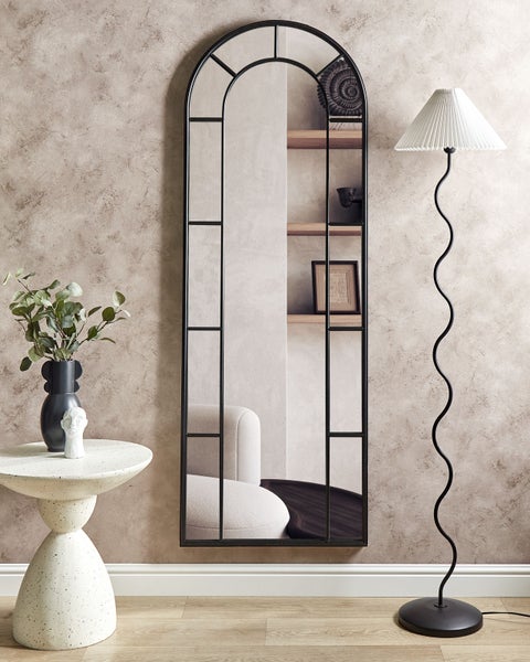 Großer Wandspiegel. Lassen Sie sich von modernem Glamour verführen - mit unserem großen, hohen Spiegel, der sich durch sein elegantes, abgerundetes Design auszeichnet. Seine glatte Oberfläche vergrößert spielerisch jeden Raum und verleiht Ihrer Einrichtung einen Hauch von moderner Eleganz. Durch seine beeindruckende Größe eignet sich der Spiegel hervorragend für Flure und Schlafzimmer. Details: Typ Wandspiegel. Stil: Industriell. Farbe: Schwarz. Material: Metall. Material: Eisen. Zusätzliches Material: Glas. Form: Bogenförmig. Finish: Gefärbt. Ausrichtung: Vertikal. Abmessungen: Tiefe: 3 cm. Breite: 60 cm. Höhe: 170 cm. Gewicht: 10 kg. .Sie kaufen: 1 x Spiegel. Produktvorteile: Inkl. Aufhängung auf der Rückseite, Ein einzigartiger Hingucker, Verleiht jedem Raum eine einzigartige Note, Wunderbar geeignet für Schlaf- und Wohnbereich, Handgefertigte Präzision. Montage: Benötigt keine Montage. Zusatzinformationen: Bitte beachten Sie, dass jedes Produkt handgefertigt ist. Abweichungen in Struktur, Farbe oder Form können aufgrund der Eigenschaften der verwendeten Materialien auftreten und stellen keinen Qualitätsmangel dar. Pflegeanleitung: Eisen: 1.Bitte ausschließlich handelsübliche, milde Reinigungsmittel und weiche Tücher verwenden, wobei feuchte Stellen sofort trocken gerieben werden sollten. 2.Vermeiden Sie scheuernde Reiniger, da diese die Oberfläche beschädigen können. 3.Bei Chrom und Kupfer regelmäßig mit speziellen Pflegemitteln polieren. Glas: 1.Bitte ausschließlich milde Reinigungsmittel bzw. Glasreiniger und weiche Tücher verwenden. Feuchte Stellen mit einem weichen Tuch trocken reiben. 2.Keine scheuernden Reinigungsmittel nutzen, da diese die Oberfläche beschädigen können.