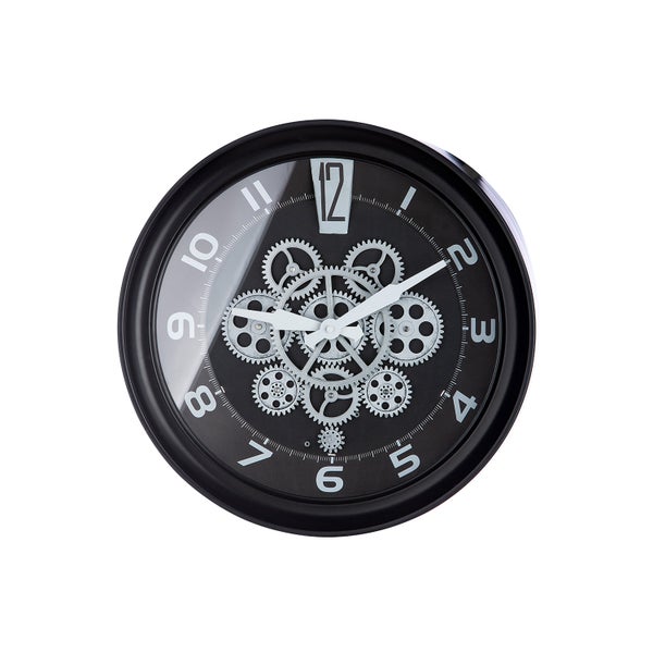 Die Zeit bleibt nicht stehen. Diese schöne Wanduhr Pinon ist ein Blickfang. Die batteriebetriebene Wanduhr ist aus Metall und Glas gearbeitet. Die schlichte Farbgebung in schwarz und silberfarben und das nostalgische Factory Design verleihen dieser Uhr ihren industriellen Charme. Der besondere „Clou“ der Uhr sind die sich permanent drehenden silberfarbenen Zahnräder welche für interessante Bewegungen innerhalb der Uhr sorgen! Die Batterien sind bei dieser Uhr nicht im Lieferumfang enthalten. benötigte Batterien: 4x AA