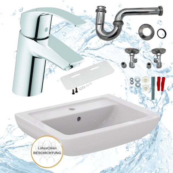 Waschtisch-Komplettset mit wandhängendem Waschtisch, Grohe Armatur, Schallschutz-Set und Zubehör
