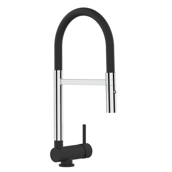Unterfenster-Küchenarmatur mit 360° schwenkbarem Auslauf und abnehmbare 2 strahl Handbrause, Verchromt und Schwarz Matt - für die Vorfenster-Montage. Abschwenkbarer Auslauf, der es erlaubt, eine Höhe von nur knapp 6 cm zu erreichen