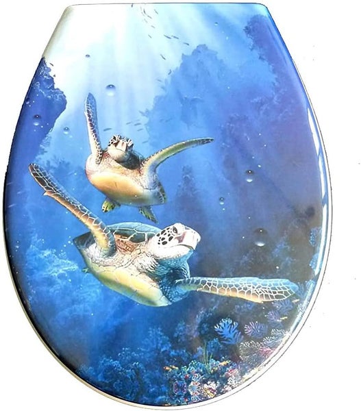 Dieser Design WC Sitz besticht durch seine klassische Form. Auf der Deckeloberseite hat er ein schönes Motiv: tauchen Sie ab ins Meer! Deckelinnenseite sowie Ringober- und Unterseite sind weiss.