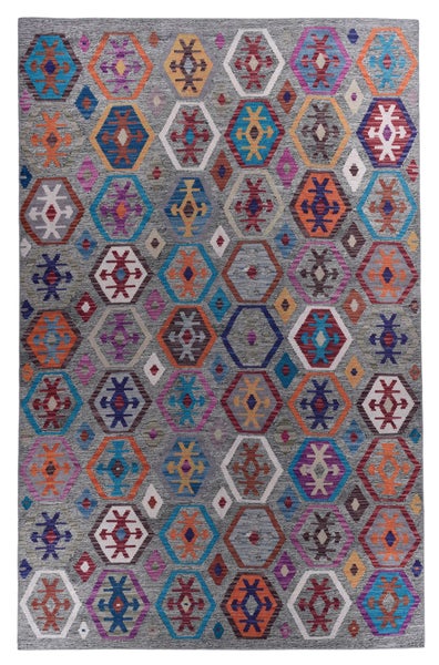 Eine wunderschöne Homage an den klassischen Kelim zeigt dieser Teppich mit seinen typischen Einzelornamenten in den fein aufeinander abgestimmten, warmen Farben. Eine Besonderheit ist die breit abgesetzte Bordüre in Beige, die dem Teppich nicht nur seinen Rahmen gibt, sondern auch die handwerkliche Komponente des Musters betont. Der Rostrote Fondton ist mit den Graugrün- Braun- Gold- und Rottönen der Ornamente sehr harmonisch aufeinander abgestimmt und ergänzt den handwerklichen Eindruck perfekt.