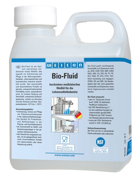 WEICON Bio-Fluid ist ein harz- und säurefreies medizinisch reines Weißöl, das speziell zur Schmierung und Pflege entwickelt wurde. Es ist wasserhell, lösemittelfrei, geruchs- und geschmacksneutral, kriechfähig sowie wasserabweisend und ist NSF-zertifiziert. Bio-Fluid mindert Reibung und Verschleiß, unterdrückt Quietschgeräusche, schützt vor Korrosion und löst Schmutz und Rost. Es kann zur Schmierung, zum Schutz und zur Pflege von Präzisionsmechanismen, als Sprühöl für Produktions- und Abfüllanlagen und als Schmierstoff an Abfüll- und Verpackungsanlagen verwendet werden und darf überall dort eingesetzt werden, wo ein gelegentlicher, technisch unvermeidbarer Kontakt mit Lebensmitteln oder deren Verpackung auftritt. WEICON Bio-Fluid wurde speziell für Anwendungen in der Nahrungsmittel-, Getränke-, pharmazeutischen und kosmetischen Industrie entwickelt.