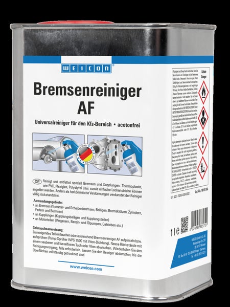 WEICON Bremsenreiniger AF ist ein acetonfreier Universalreiniger für den Automobilbereich. Der Flüssigwirkstoff reinigt, entfettet und verdunstet völlig rückstandsfrei. Bremsenreiniger AF entfettet und reinigt schnell und mühelos Metalle, Glas, Gummimaterialien, pulverbeschichtete Oberflächen, viele Kunststoffe und entfernt zuverlässig öl- und fetthaltige Verschmutzungen und Rückstände. Der Reiniger kann an Bremsen (Trommel- und Scheibenbremsen, Belägen, Bremsklötzen, Zylindern, Federn und Buchsen), an Kupplungen (Kupplungsbelägen und -teilen) oder an Motorteilen (Vergasern, Benzin- und Ölpumpen, Getrieben etc.) zum Einsatz kommen. Er eignet sich aber auch zur Reinigung von Kunststoffprofilen, Dichtungen oder lackierten Flächen und kann in vielen Bereichen der Industrie sowie im Handwerk verwendet werden.