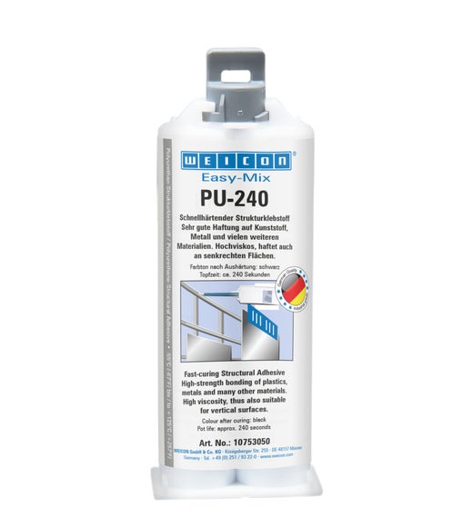 Der Strukturklebstoff WEICON Easy-Mix PU-240 ist nach ca. 30 Minuten schleif- und überlackierbar, witterungs-, chemikalienbeständig und temperaturbeständig von -55°C bis +125°C (-67 bis +257°F). PU-240 verbindet zahlreiche Materialien, wie Faserverbundwerkstoffe, Kunststoffe, Polyurethan, Epoxyde, Polyester, Metalle, Holz und Keramik, mit hoher Zug-, Scher- und Schälfestigkeit mit- und untereinander. PU-240 kann in der Kunststofftechnik, im Maschinenbau, Modell- und Formenbau, im Metallbau, im Schiffs- und Bootsbau, im Karosserie- und Fahrzeugbau, im Messeund Ausstellungsbau sowie in vielen weiteren Bereichen zum Einsatz kommen.
