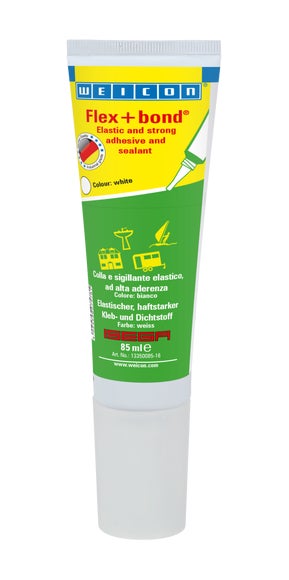 WEICON Flex+bond ist haftstark, dauerelastisch, temperaturbeständig von -40°C bis +90°C (-40 bis +194°F), witterungsbeständig, UV-stabil, „nass in nass“ überlackierbar, schleiffähig, alterungsbeständig, beständig gegenüber Salzwasser und ist silicon-, isocyanat-, halogen- und lösemittelfrei. Flex+bond ist ISEGA zertifiziert und kann als Klebstoff in der Lebensmitteltechnologie verwendet werden. Mit Flex+bond lassen sich nahezu sämtliche Materialien, wie Metall, Holz, Kunststoff, Glas, Keramik, mit- und untereinander verbinden. WEICON Flex+bond kann in vielen Bereichen der Industrie zum Einsatz kommen.