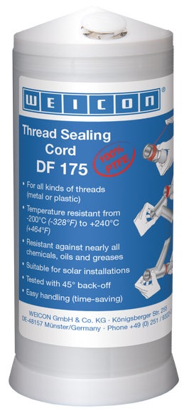 WEICON DF 175 ist ein patentierter Gewinde-Dichtfaden aus 100% PTFE und dichtet nahezu alle Metall- und Kunststoffgewinde dauerhaft und sicher ab. WEICON DF 175 gleicht den Zwischenraum an den Gewinden zuverlässig aus und bildet beim Verschrauben einen PTFE-Film in der benötigten Stärke. Dieser Film ist extrem widerstandsfähig gegen beinahe alle Chemikalien, selbst aggressivste Lösemittel, Laugen und Säuren. WEICON DF 175 ist nicht brennbar und in einem Temperaturbereich zwischen -200°C bis +240°C (-328 bis +464°F) funktionssicher. Im Gegensatz zu anderen Abdichtungsmaterialien, bei denen das Gewebe lediglich als Träger für das eigentliche Dichtmittel dient, ist WEICON DF 175 selbst das Dichtmaterial. Eine Trennung von Träger- und Dichtungsmaterial über die Lebensdauer der Verschraubung ist somit ausgeschlossen. WEICON DF 175 ist unbegrenzt haltbar und bleibt immer weich und biegsam. WEICON DF 175 ist sehr ergiebig: Mit einer Rolle lassen sich bis zu 20 Rollen PTFE-Band (12 mm x 0,1 mm x 12 m) ersetzen.