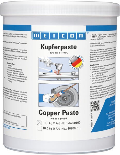 WEICON Kupferpaste ist ein Schutz-, Trenn- und Schmierstoff, hochtemperatur- und korrosionsbeständig, haftstark und schwefel-, blei- und nickelfrei. Kupferpaste wird als Montageschmierung für Schraubverbindungen und Gleitflächen aller Art eingesetzt. Es bildet auf Einsteckwerkzeugen, Verschleißbuchsen, Schrauben, Schraub-, Steck- sowie Bajonettverbindungen aller Art einen wirksamen Schmier- und Trennfilm, der die Funktionsflächen vor Korrosion und Passungsrost schützt. Es kann zur Vibrationsreduzierung an Bremsklötzen und Führungen, Bremsnocken und Stiften, an PKW- und LKW-Batteriepolen sowie anderen elektrischen Verbindungen, an Radschrauben bzw. Radmuttern und an Verschleißbuchsen an Elektro-, Druckluftund Hydraulikhämmern verwendet werden.