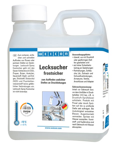 Lecksucher frostsicher dient zum sicheren, einfachen und schnellen Auffinden von Rissen oder porösen Stellen an Gasleitungen. Lecksucher frostsicher geht mit den Gasen Kohlendioxid (CO2), Propan, Butan, Acetylen, Sauerstoff, Stadt- und Erdgas, Stickstoff, Lachgas (N2O ) und Fluorkohlenwasserstoff keine gefährlichen Verbindungen ein und ist nicht brennbar. Lecksucher frostsicher kann überall dort eingesetzt werden, wo mit Druckluft oder gasförmigen Stoffen gearbeitet wird, wie z.B. an Rohrleitungen, Schläuchen, Löt-, Schraub- und Schweißverbindungen, Armaturen, Ventilen, Anschlüssen und Adaptern.