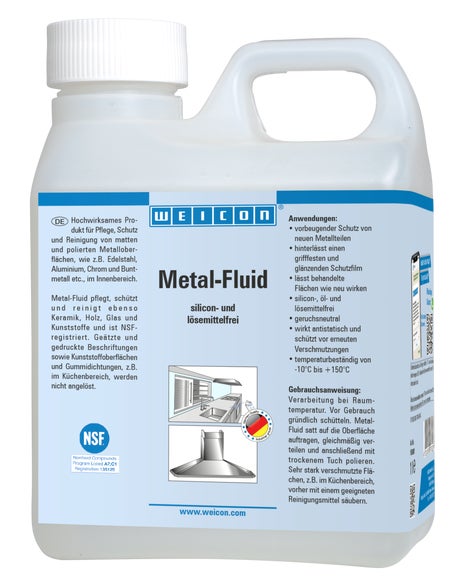 WEICON Metal-Fluid ist ein Pflege- und Reinigungsmittel für matte und polierte Oberflächen im Innenbereich und ist NSF-zertifiziert. Metal-Fluid pflegt, schützt und reinigt sowohl Metalloberflächen als auch Keramik, Holz, Glas und Kunststoffe. Geätzte und gedruckte Beschriftungen sowie Kunststoffoberflächen und Gummidichtungen werden nicht angelöst.