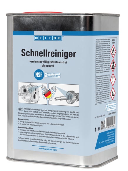 Der Schnellreiniger verfügt über eine NSF Registrierung für den Lebensmittelbereich und kann somit als Reiniger und Entfetter zur Schmutzentfernung im Rahmen von Instandsetzungsarbeiten sowie zur Entfernung von Klebstoffen in der Lebensmittelindustrie, in der Nahrungsmittel- und Getränkeindustrie sowie der pharmazeutischen und kosmetischen Industrie eingesetzt werden. Schnellreiniger wird zum Reinigen und Entfetten von Oberflächen verwendet, die mit WEICON Kleb- und Dichtstoffen verklebt bzw. abgedichtet oder mit WEICON Metallsprays beschichtet werden sollen. Schnellreiniger ist pH-neutral und materialverträglich und kann auf vielen Werkstoffen, wie z.B. Metallen und Glas, Keramik und den meisten Gummi und Kunststoffen eingesetzt werden. Aufgrund seiner speziellen Rezeptur und der daraus resultierenden NSF Registrierung, kann der Schnellreiniger zur Verbesserung der Arbeitsplatzsicherheit und des Gesundheitsschutzes beitragen.