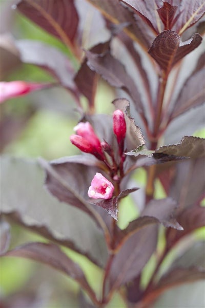 Weigela florida ‘Victoria’, die Purpur-Weigelie, ist ein eleganter Blütenstrauch, der mit dunkel purpurfarbenem bis bronzerotem Laub und reichlicher rosaroter Blüte sofort ins Auge fällt. Der kompakte, breitbuschige Zierstrauch entwickelt leicht überhängende Triebe und erreicht je nach Standort etwa 1,5 bis 2 Meter Höhe und bis zu 1,5 Meter Breite. Von Mai bis Juni erscheinen in großer Fülle die typischen, trichterförmigen Blüten in zartem Rosa bis kräftigem Purpurrosa, häufig gefolgt von einer leichten Nachblüte im Spätsommer, die den Gartenstrauch bis in den Herbst attraktiv hält. Das dunkle Laub bildet einen edlen Kontrast zu hellen Stauden und immergrünen Gehölzen und macht die Sorte sowohl als Solitär als auch in der Gruppenpflanzung zu einem markanten Blickfang.