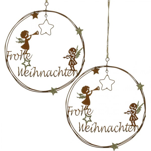 Weihnachtsdeko Metallring mit Schriftzug und Engelmotiv, 2 Stück