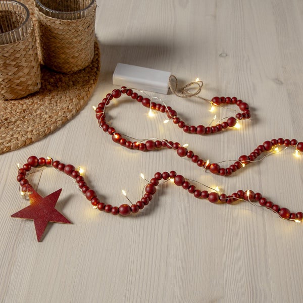 Weihnachtslichterkette ,Beady` mit Holzperlen und Stern, Batterien + Timer, warmweiß, rot, L 150cm Dekorative Lichterkette ,Beady' mit roten Holzperlen für stimmungsvolle Dekorationen