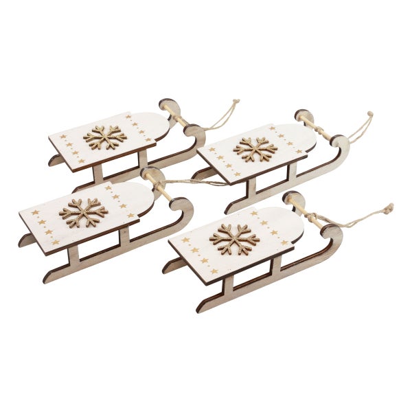 Weihnachtsschlitten Holz Deko Weiß Gold Schneeflocke 15,5x6,5x4cm 4er Set, 4 Stück