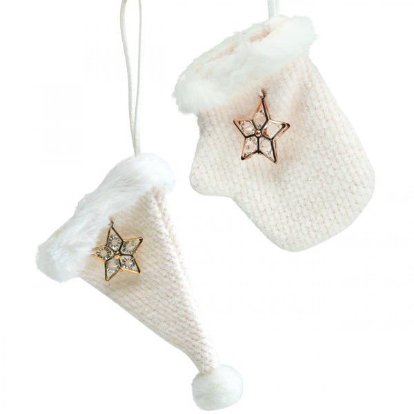 Weihnachtsschmuck Filzanhänger Set Creme - Handschuh & Zipfelmütze mit Stern, Festliche Christbaumschmuck Deko 6St