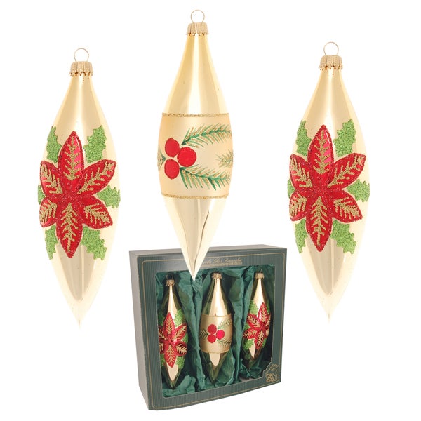 Das Glasoliven Set Weihnachtsstern & Beeren ist ein wunderschöner Christbaumschmuck, der aus drei mundgeblasenen und handdekorierten Glasoliven besteht. Dieses Set ist das perfekte Accessoire für jeden Weihnachtsbaum, da es eine klassische und traditionelle Optik hat.Die Glasoliven sind aus echtem Glas gefertigt und haben eine Größe von 15cm. Das Set ist mit einem Gold Glanz und einem Rot/Grünen Dekor mit Glitter verziert, was dem Baum eine festliche und glänzende Note verleiht.Dieser Christbaumschmuck ist nicht nur schön anzusehen, sondern auch von hoher Qualität. Jede Olive wurde sorgfältig von Hand dekoriert, um eine perfekte Optik zu gewährleisten. Das Set ist robust und langlebig, so dass Sie es Jahr für Jahr wieder verwenden können.Das Glasoliven Set Weihnachtsstern & Beeren ist ein Muss für jeden, der einen traditionellen und klassischen Weihnachtsbaum schmücken möchte. Es ist ein zeitloses Accessoire, das nicht nur in diesem Jahr, sondern auch in den kommenden Jahren ein Blickfang sein wird.Insgesamt ist das Glasoliven Set Weihnachtsstern & Beeren ein wunderschöner Christbaumschmuck, der Ihrem Weihnachtsbaum eine festliche Note verleiht. Es ist von hoher Qualität und wird sicherlich ein Highlight auf Ihrem Baum sein. Bestellen Sie noch heute und lassen Sie Ihren Baum in neuem Glanz erstrahlen!