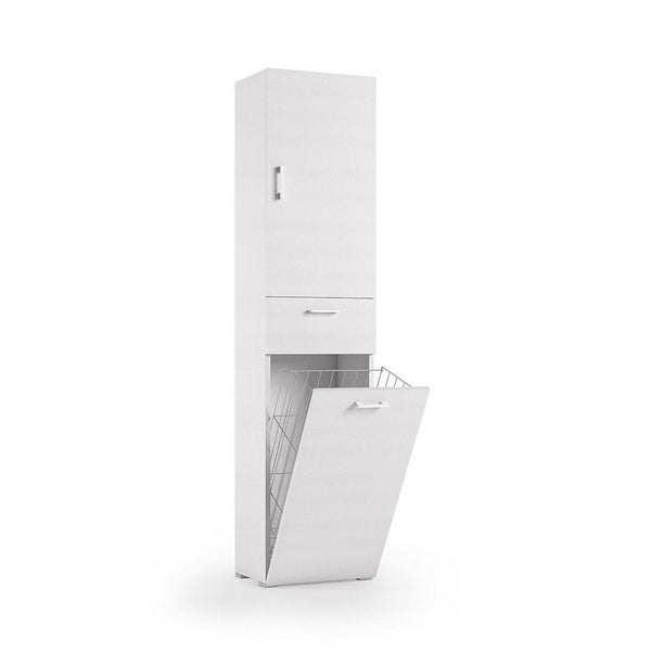 Dieses weiße Mehrzweckmöbel mit integriertem Wäschekorb ist kompakt und funktional, ideal, um Bad, Waschraum oder Vorraum ordentlich zu halten. Unten befindet sich ein Wäschekorb für schmutzige Wäsche, darüber ein Schubfach und ein Fach mit Tür. Mit nur 32 cm Tiefe passt das Möbelstück selbst hinter eine Tür. Die klare, moderne Optik in Weiß fügt sich in jeden Einrichtungsstil ein und bietet zugleich praktischen Stauraum für Handtücher, Wäsche oder Reinigungsmittel. Hergestellt aus robusten Holzplatten, wird es zur Selbstmontage geliefert.