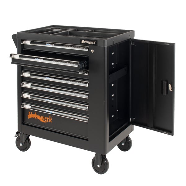 Mit 7 Schubladen und einer Seitentür, bietet er genügend Stauraum für alles, was für präzises und sicheres Arbeiten benötigt wird. Die 7. Schublade ist mit seinem größerem Volumen ideal zur individuellen Nutzung, beispielsweise für Elektrowerkzeuge.