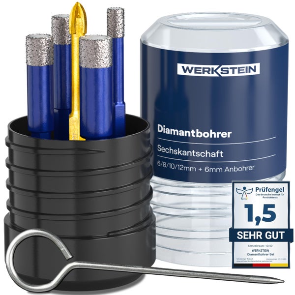 WERKSTEIN Fliesenbohrer Set - 6I8I10I12mm Glasbohrer & 6mm Karbid-Anbohrer - Diamantbohrer zum Bohren von Fliesen, Glas, Marmor, Granit uvm. - Keramikbohrer/Diamantbohrer für harte Fliesen
