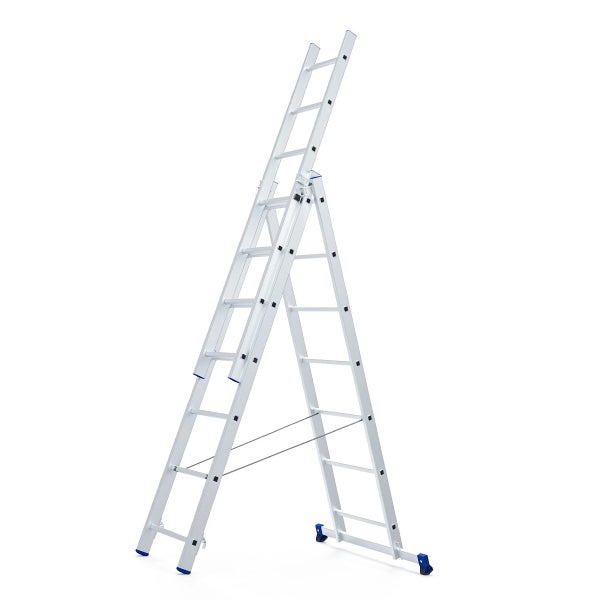 Du arbeitest nach dem Motto „Geht nicht, gibt’s nicht“? Diese Kombileiter auch, denn sie ist Anlegeleiter, Stehleiter, Schiebeleiter und Stehleiter mit Aufsteckverlängerung in einem. So eine hat man als Profi immer gerne dabei: viele Einsatzmöglichkeiten, kompaktes Format, gut zu transportieren. Hochbelastbare, breite Quertraverse mit rutschfesten Füßen für festen Stand Langlebige Führungsbeschläge aus Stahl Hochfeste Spreizsicherung Haken mit Verriegelung für sicheres Arretieren und einfachen Transport 478 mm breit für mehr Arbeitskomfort Belastbar bis 150 kg Nach Norm EN 131 Von unabhängiger Prüfstelle zertifiziert