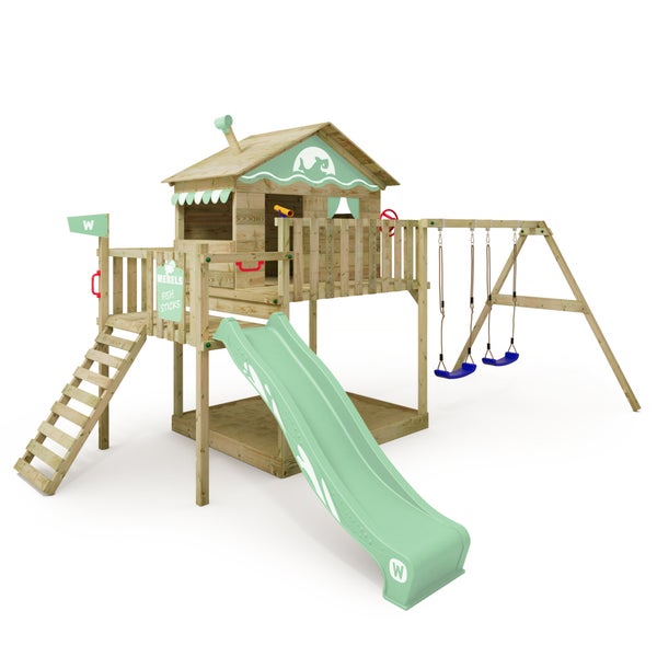 WICKEY Spielturm Klettergerüst Smart Coast mit Schaukel und Rutsche, Stelzenhaus mit Sandkasten, Kletterleiter und Spiel-Zubehör – pastellgrün