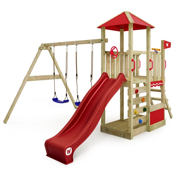 WICKEY Spielturm Klettergerüst Smart Savana mit Schaukel und Rutsche, Spielhaus mit Kletterleiter und Spiel-Zubehör – rot