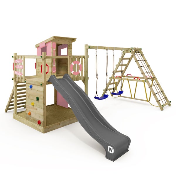 WICKEY Spielturm Klettergerüst Smart Surf mit Schaukel und Rutsche, Kletterturm mit Sandkasten, Leiter und Spiel-Zubehör – pastellpink