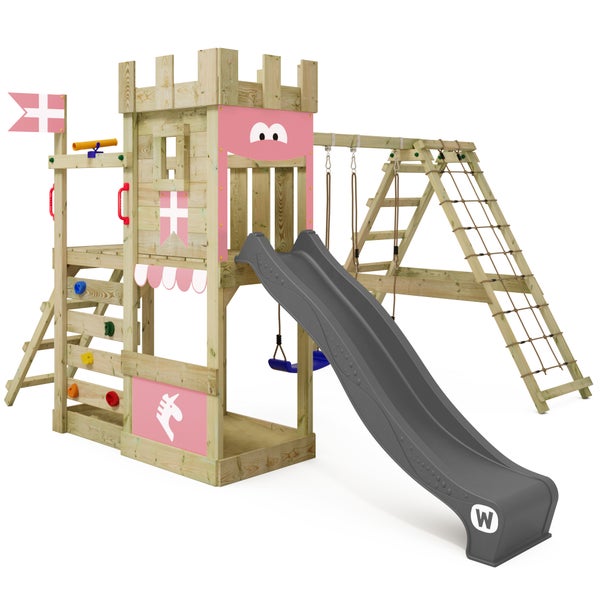 WICKEY Spielturm Ritterburg DragonFlyer mit Schaukel und Rutsche, Spielhaus mit Sandkasten, Kletterleiter und Spiel-Zubehör – anthrazit