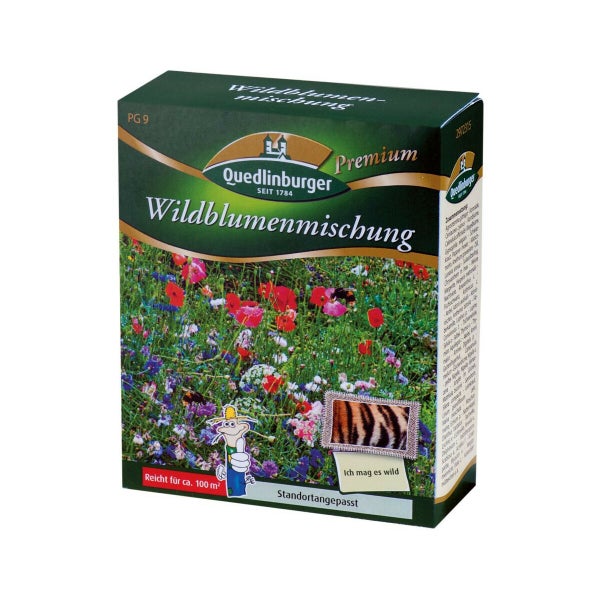 Unsere Wildblumenmischung enthält hauptsächlich einjährige, aber auch mehrjährige Arten, die mit ihrer attraktiven Blüte sowohl Menschen als auch Insekten, wie z.B. Bienen und Schmetterlinge, erfreuen. Es handelt sich um Arten, die auf allen Böden gedeihen und sich zur Gestaltung von naturnahen Gärten eignen. Die Wildblumenwiese kann als Neuanlage, aber auch als Folgesaat von Blumenwiesen genutzt werden. Wuchshöhe ca. 80 - 100 cm.