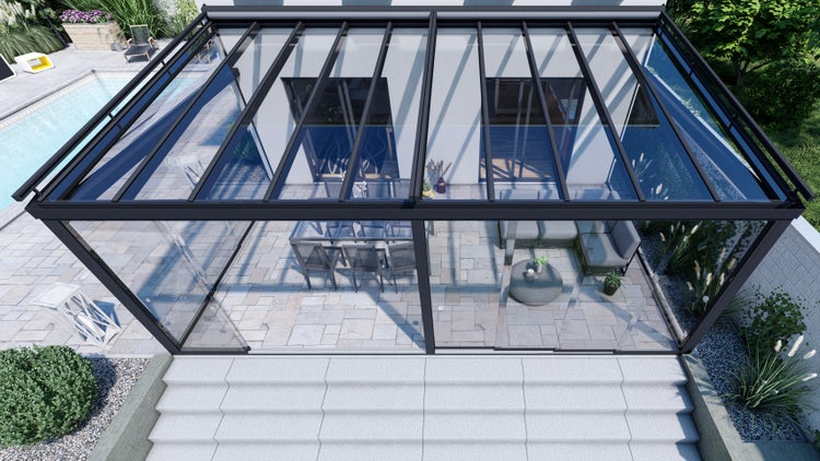 Das Dach des Wintergartens besteht aus Klarglas (VSG-Sicherheitsglas). Dieses zeichnet sich durch hohe Lichtdurchlässigkeit, Stabilität und Robustheit aus. Sie können zwischen 8 mm und 10 mm Stärke wählen.