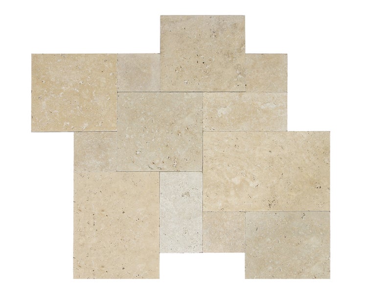 Ein Paket Römischer Verband beinhaltet 6 Travertinplatten in 1,2 cm Stärke und entspricht einer Fläche von 0,74 m².