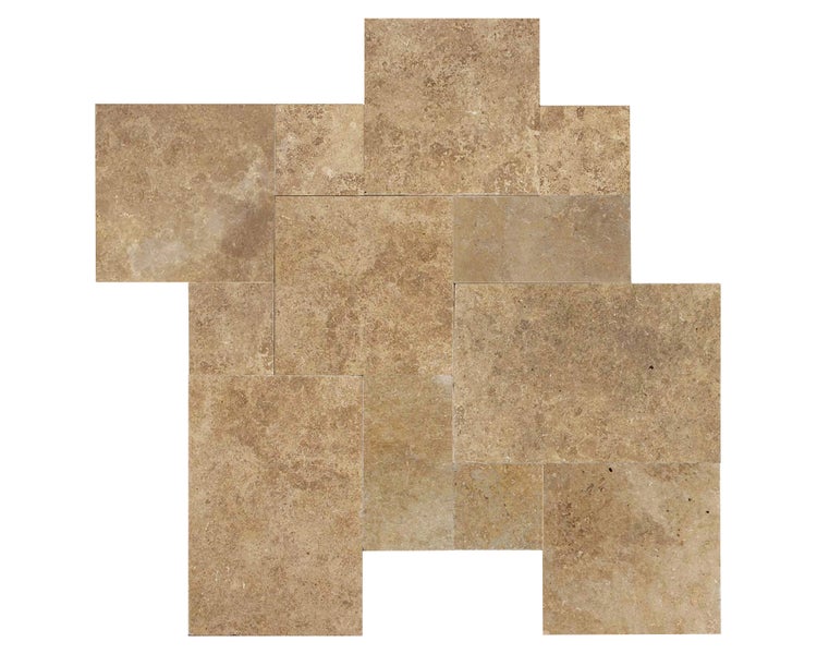 Ein Pack Römischer Verband Terrassenplatten (halber Römischer Verband) beinhaltet 6 Travertinplatten in 3 cm Stärke und entspricht einer Fläche von 0,74 m².