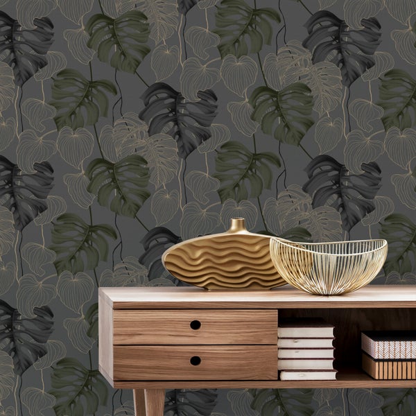 Die Tapete hat einen raffinierten grauen Grundton und ist mit zarten gold- und grünfarbenen Blättern verziert, die ihr ein schönes und elegantes Aussehen verleihen. Dank des Vliesmaterials lässt sich Paradiso einfach und mit minimalem Kraftaufwand anbringen, um ein glattes Ergebnis zu erzielen.